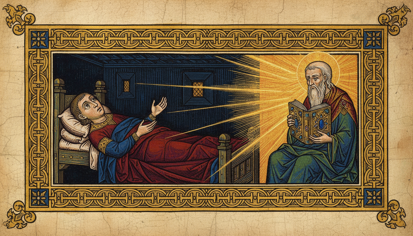 When night came, the king lay awake for a long time, and thought about the things that had happened that day. At last he fancied that he saw a great light like the sun; and in the midst of the light there stood an old man with black hair, holding an open book in his hand.